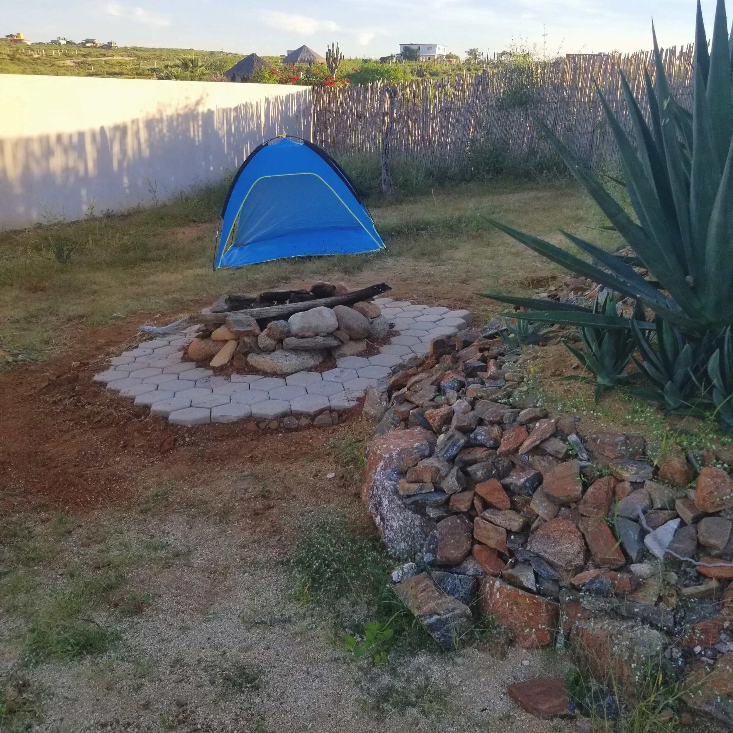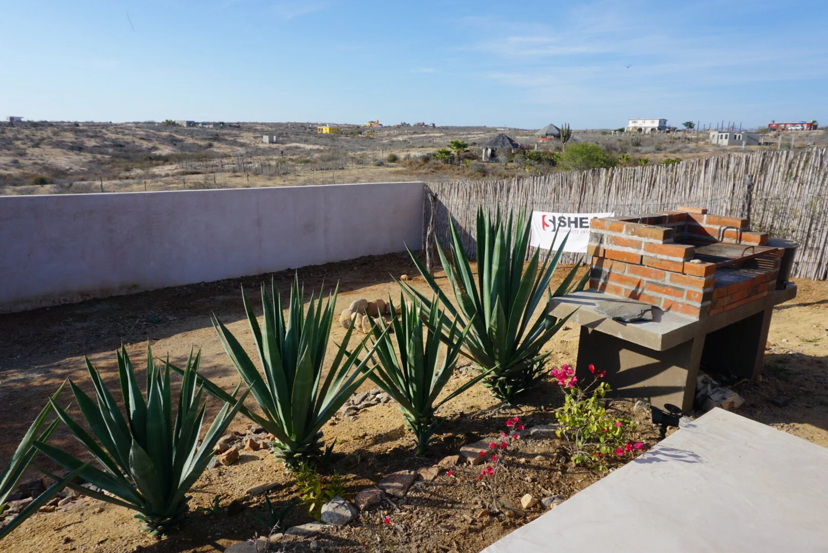 The yard includes your very own fire pit, whose warmth you’ll appreciate on the cool desert nights. There is also a coal grill for cooking freshly caught red snapper you picked up from the fishermen down in Pescadero Beach, a large patio with a table and zero gravity chairs and gardens to stroll around in and enjoy the cacti, palms and other flowering species. Your backdrop to the east is the 7,000 foot Sierra de la Laguna mountain range. To the west, Pacific sunsets enjoyed right from the patio will not disappoint. There are friendly neighbors several plots away, and plenty of privacy within the 6 foot walls.